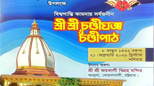 বোয়ালখালী ( চট্টগ্রাম ) প্রতিনিধি বোয়ালখালী উপজেলার আহ্লা এলাকায় অবস্থিত নবনির্মিত শতবর্ষের ঐতিহ্যবাহী আহ্লা শ্রী শ্রী জয়কালী বিগ্রহ মন্দির-এর ২য় প্রতিষ্ঠাবার্ষিকী আগামী ২১ ফেব্রুয়ারি ২০২৬ খ্রিস্টাব্দ, শনিবার পালিত হবে। প্রতিষ্ঠাবার্ষিকী